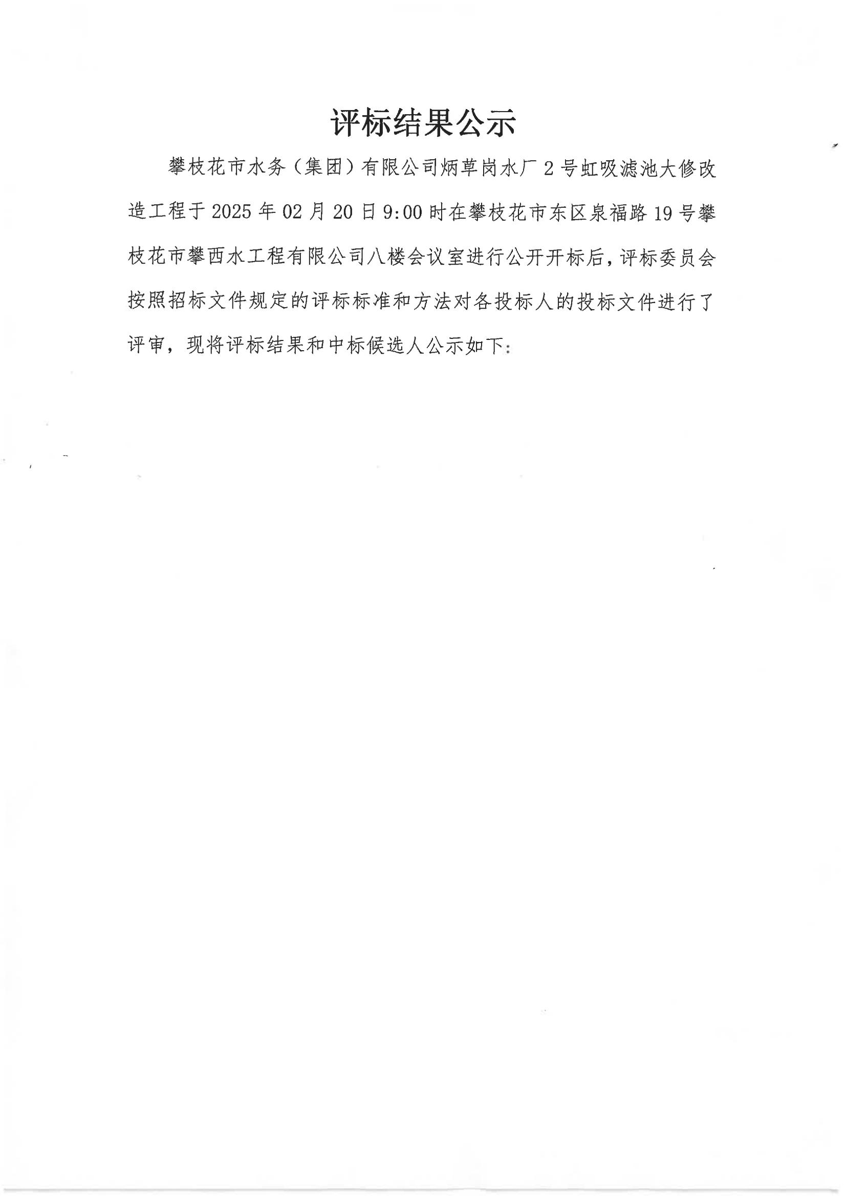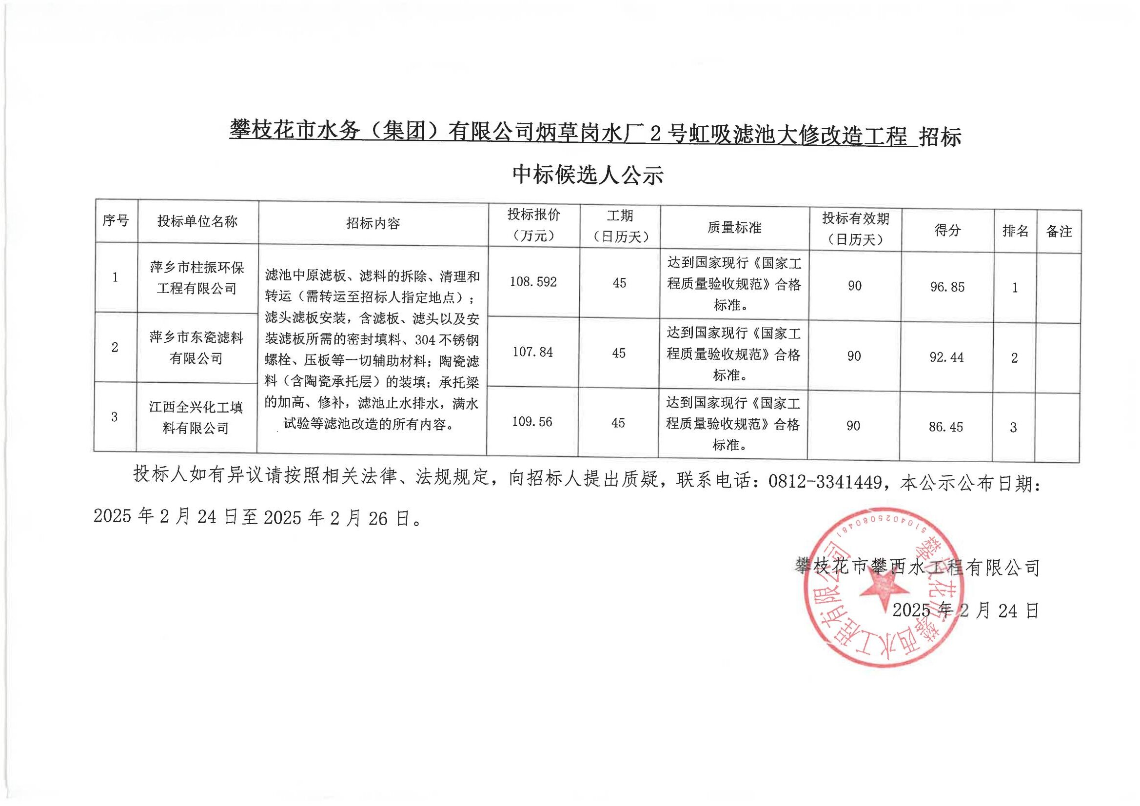 攀枝花市水務(集團)有限公司炳草崗水廠2號虹吸濾池大修改造工程中標候選人公示