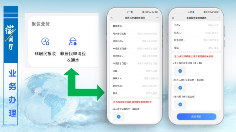 當(dāng)用水施工完成,達(dá)到通水條件,用戶同樣可在“微網(wǎng)廳”中,辦理驗(yàn)收通水申請,填寫相關(guān)信息,上傳附件,提交預(yù)約,后臺工作人員會主動(dòng)聯(lián)系用戶,進(jìn)行驗(yàn)收通水。