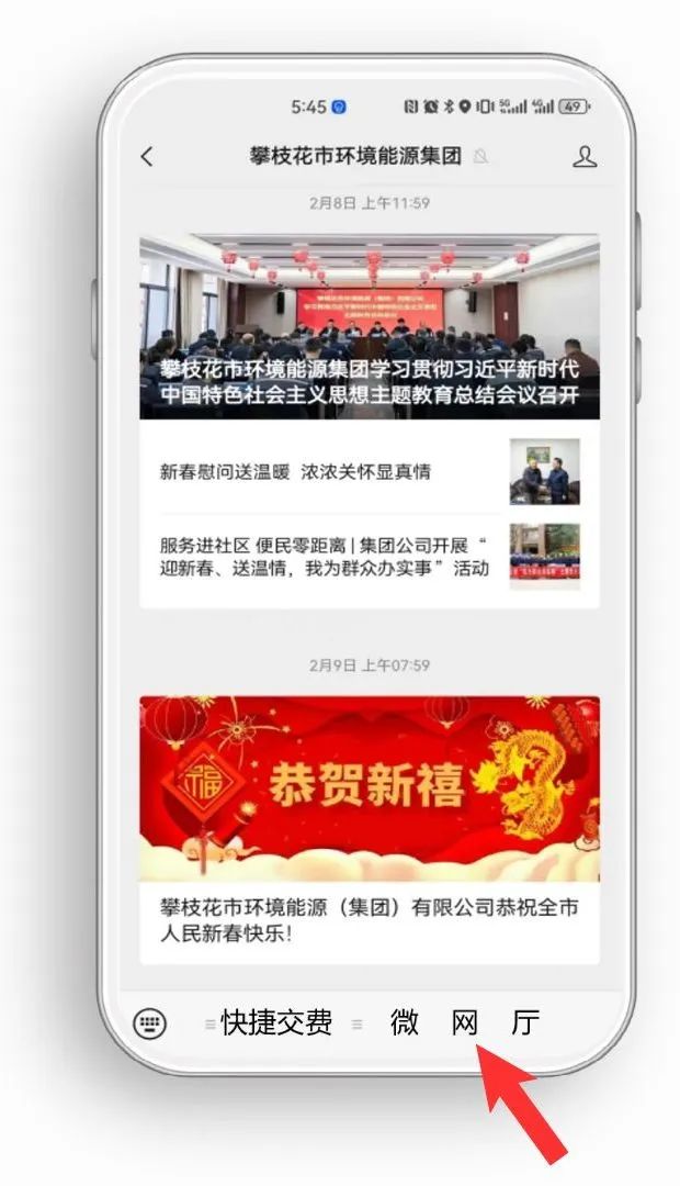 進(jìn)入攀枝花市環(huán)境能源集團(tuán)微信公眾號,點(diǎn)擊屏幕下方“微網(wǎng)廳”。