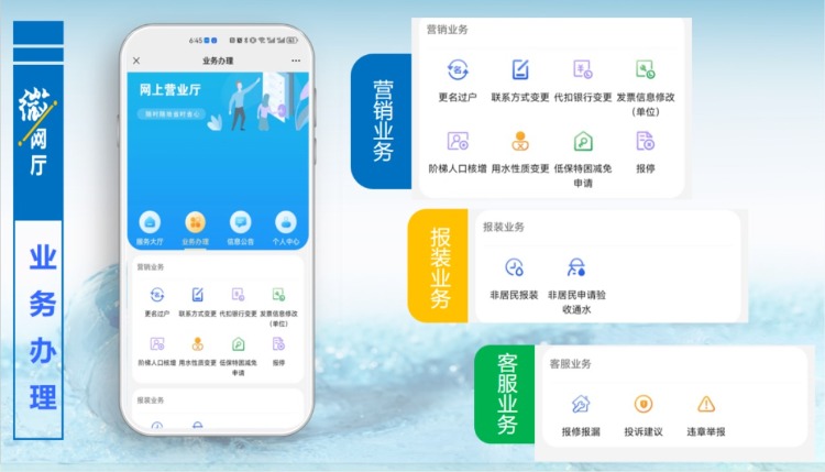 按照提示步驟,綁定用水開戶賬號后,就能輕松便捷使用“微網(wǎng)廳”各項(xiàng)服務(wù)功能。用水開戶賬號可查閱供水合同、服務(wù)短信或致電供水服務(wù)片區(qū)營業(yè)服務(wù)熱線進(jìn)行查詢。