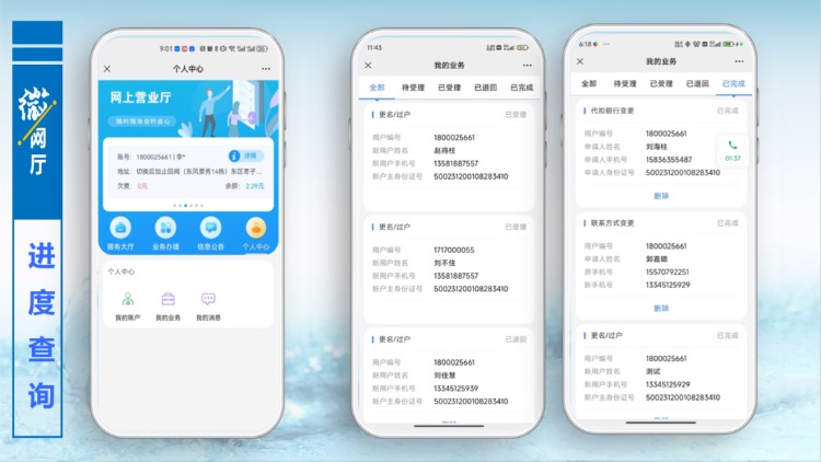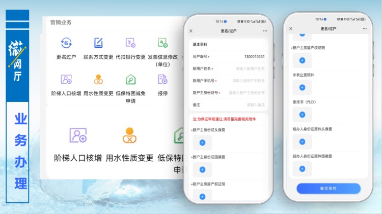 以更名過戶為例,用戶點(diǎn)擊更名過戶功能按鈕,進(jìn)入提交資料界面,按照頁面提示,填寫相關(guān)信息和拍照上傳附件,提交預(yù)約,后臺管理人員審核通過,便完成更名過戶辦理,用戶無需再到營業(yè)大廳線下辦理任何手續(xù)。