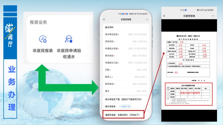 用戶可在報(bào)裝業(yè)務(wù)版塊中申請獲得用水。進(jìn)入報(bào)裝業(yè)務(wù)版塊,下載用水審批表,按照示例圖片,完善表格內(nèi)容,再拍照上傳,填寫好相關(guān)信息及附件,提交預(yù)約后,由后臺工作人員接單,進(jìn)入辦理流程,流程完結(jié),告知申請人是否滿足接水條件,完成報(bào)裝申請。
