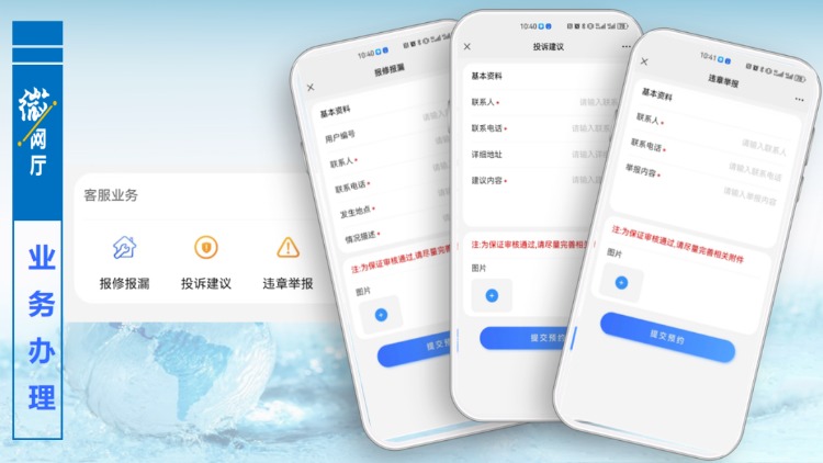 客服業(yè)務(wù)版塊主要是針對報(bào)修報(bào)漏,只要提交相關(guān)信息,工作人員會及時(shí)與用戶取得聯(lián)系進(jìn)行處理。“微網(wǎng)廳”已開通投訴建議通道,對用戶提出的投訴和建議,將會第一時(shí)間進(jìn)行回復(fù)和處理,同時(shí)歡迎大家對身邊的違章用水現(xiàn)象進(jìn)行舉報(bào)。